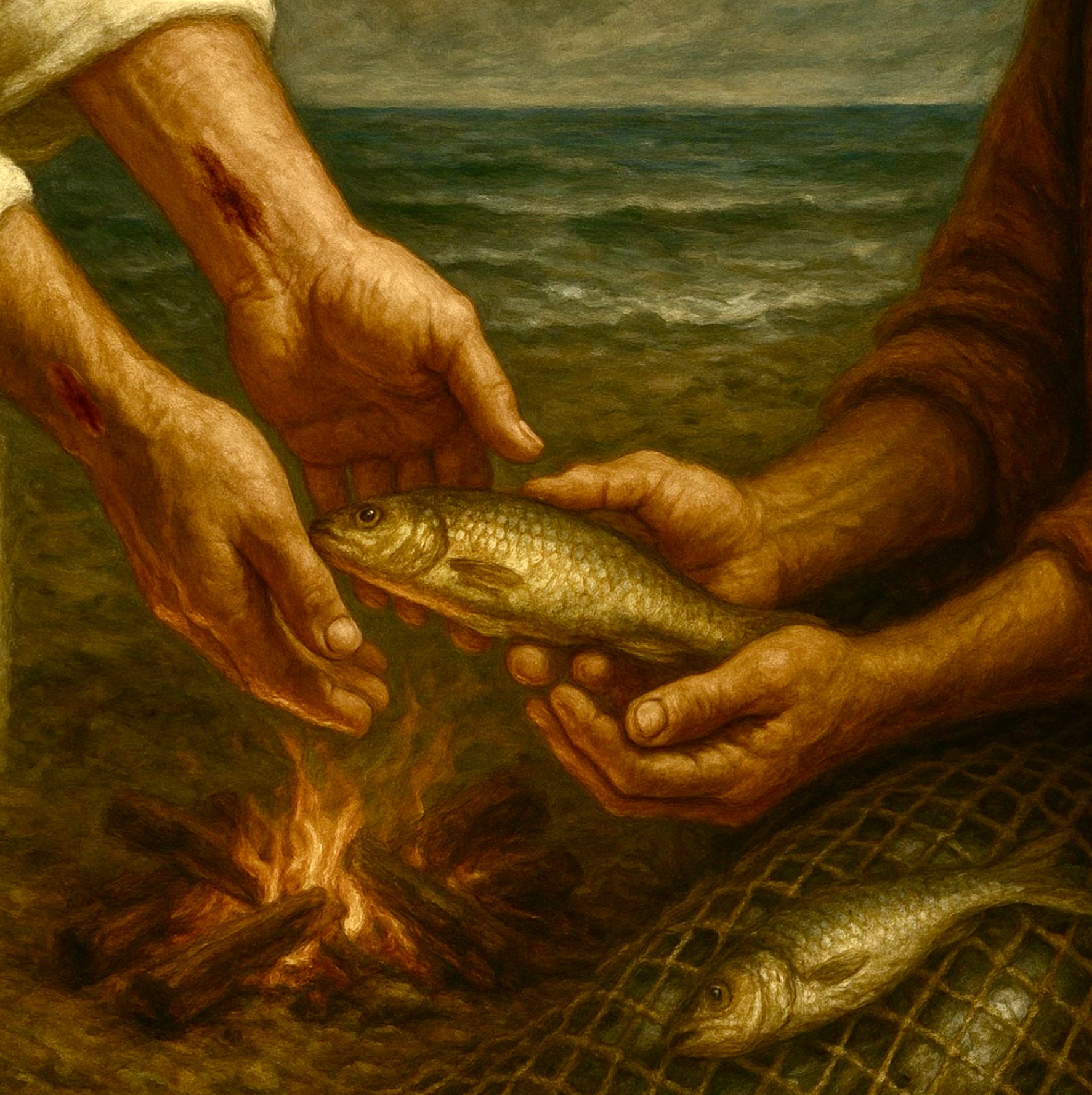 The risen Jesus doesn’t appear with lightning or thrones, but with food, a charcoal fire, and a reconciliation and commission.
