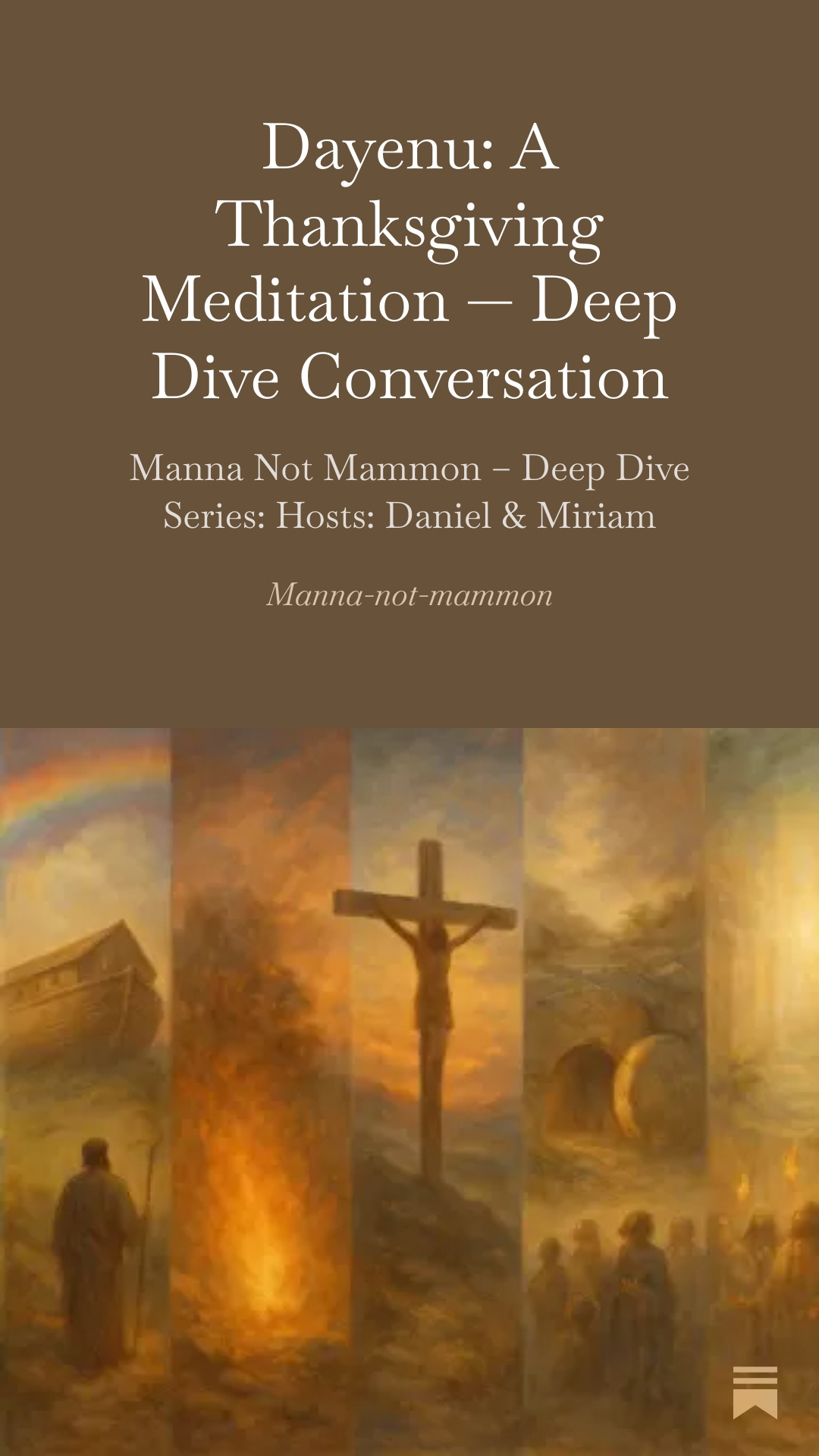 This Thanksgiving Deep Dive explores the ancient posture of Dayenu — “it would have been enough.” Released alongside the written reflection on Manna Not Mammon, this conversation with Daniel and Miriam walks through seventy-seven biblical names and moments where Jesus has revealed His mercy and His heart. Each one becomes a reminder that even a single act of His goodness would have been enough — and yet He has given far more. A quiet, meditative companion to the written piece, inviting you into gratitude, remembrance, and rest. In the Passover tradition this posture is called Dayenu. Each line declares that if the Lord had done only this single act, it would have been enough to praise Him forever. That word drew me back through Scripture — through the names by which Jesus has made Himself known — and I began to reflect on seventy-seven of them. This list is offered in the hope that it might awaken the same gratitude in every heart that reads it.