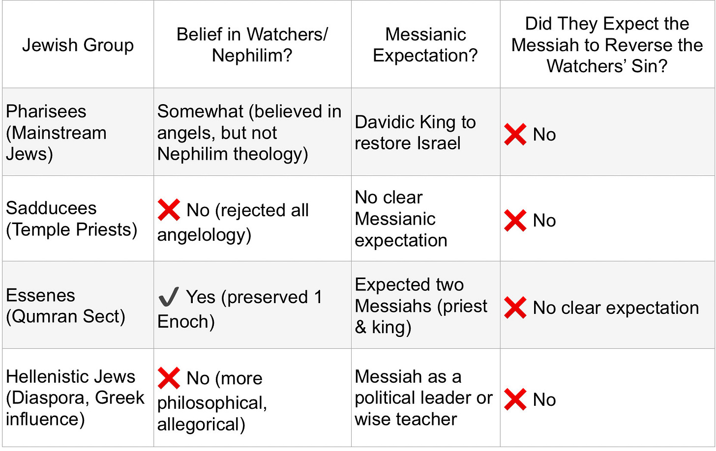 • The Pharisees (mainstream Jews) did not expect the Messiah to reverse the Watchers’ sin.
