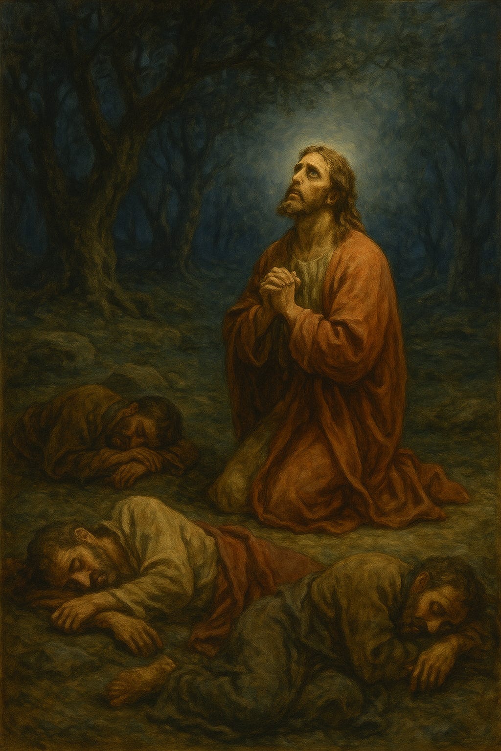 He asks His friends to stay awake with Him. To pray and to watch. But they cannot. Three times He asks but they sleep. Jesus weeps, sweats blood, and yields His will alone. He is not rescued from the storm. He walks into it……