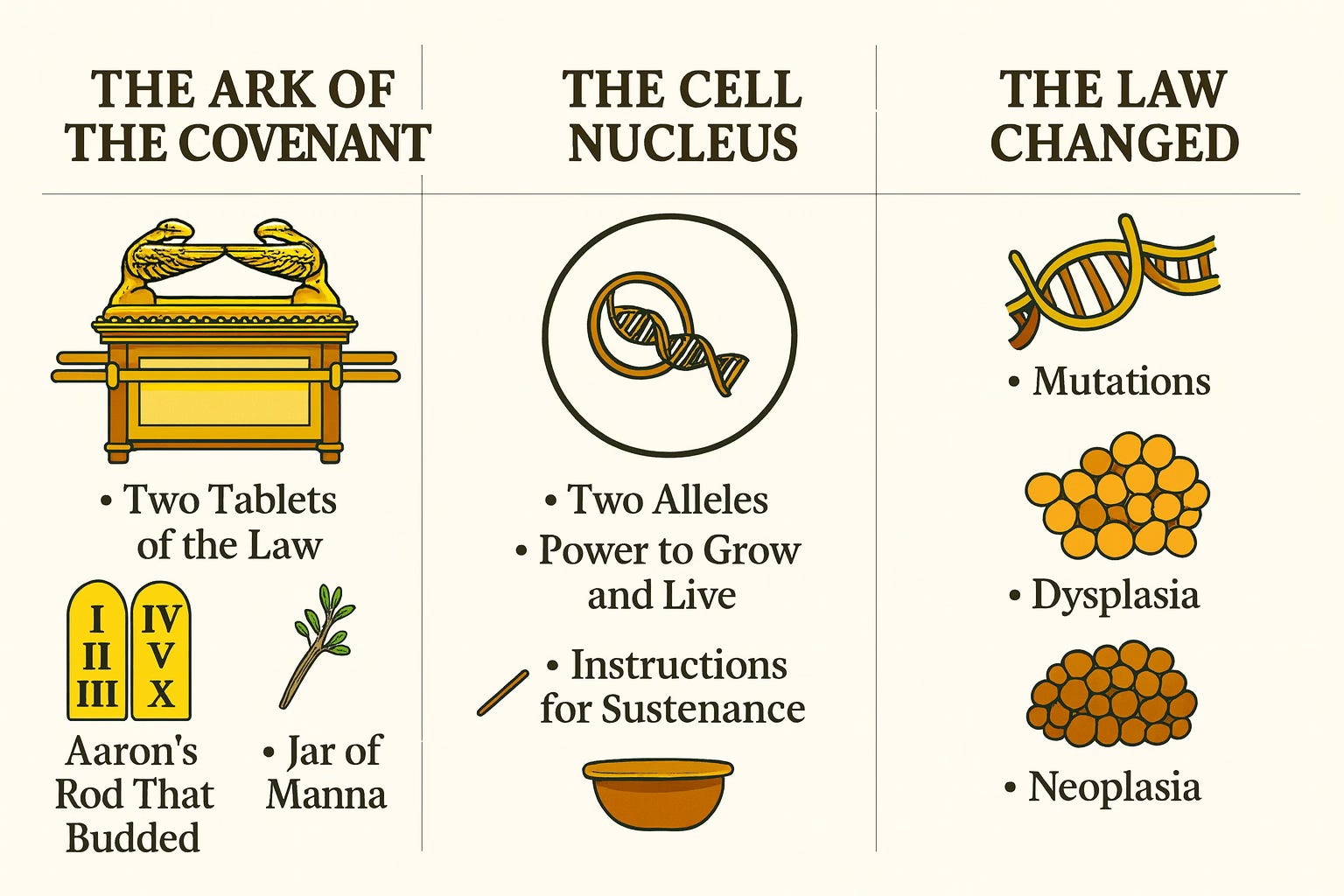 From the substack mannanotmamon this presents a spiritual and scientific analogy that connects the biological design of a living cell to the sacred structures and covenants of the Bible, particularly the Holy of Holies and the Ark of the Covenant. The author, a pathologist, argues that the cell’s nucleus mirrors the Ark, serving as a sanctuary that holds the essential code of life, much like the Ark contained God’s law. A central theme is the “testimony of two witnesses,” which the text applies to both genetic structure—specifically the paired chromosomes and alleles—and the consistent confirmation pattern found throughout scripture, such as the two tablets of stone and the paired witnesses to Christ’s life. Ultimately, the text interprets cellular life, its order, and its potential for decay as a parable of divine order and redemption found completely in Jesus Christ, who fulfills all the types represented by the Ark’s contents.