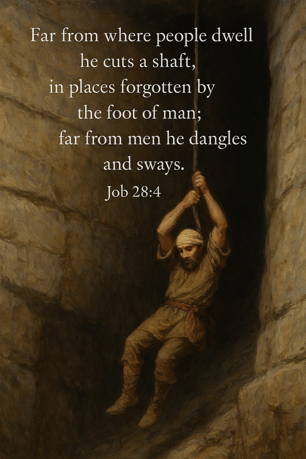 “Far from human dwellings he cuts a shaft, in places untouched by the foot of man; far from other people he dangles and sways.”—Job 28:4