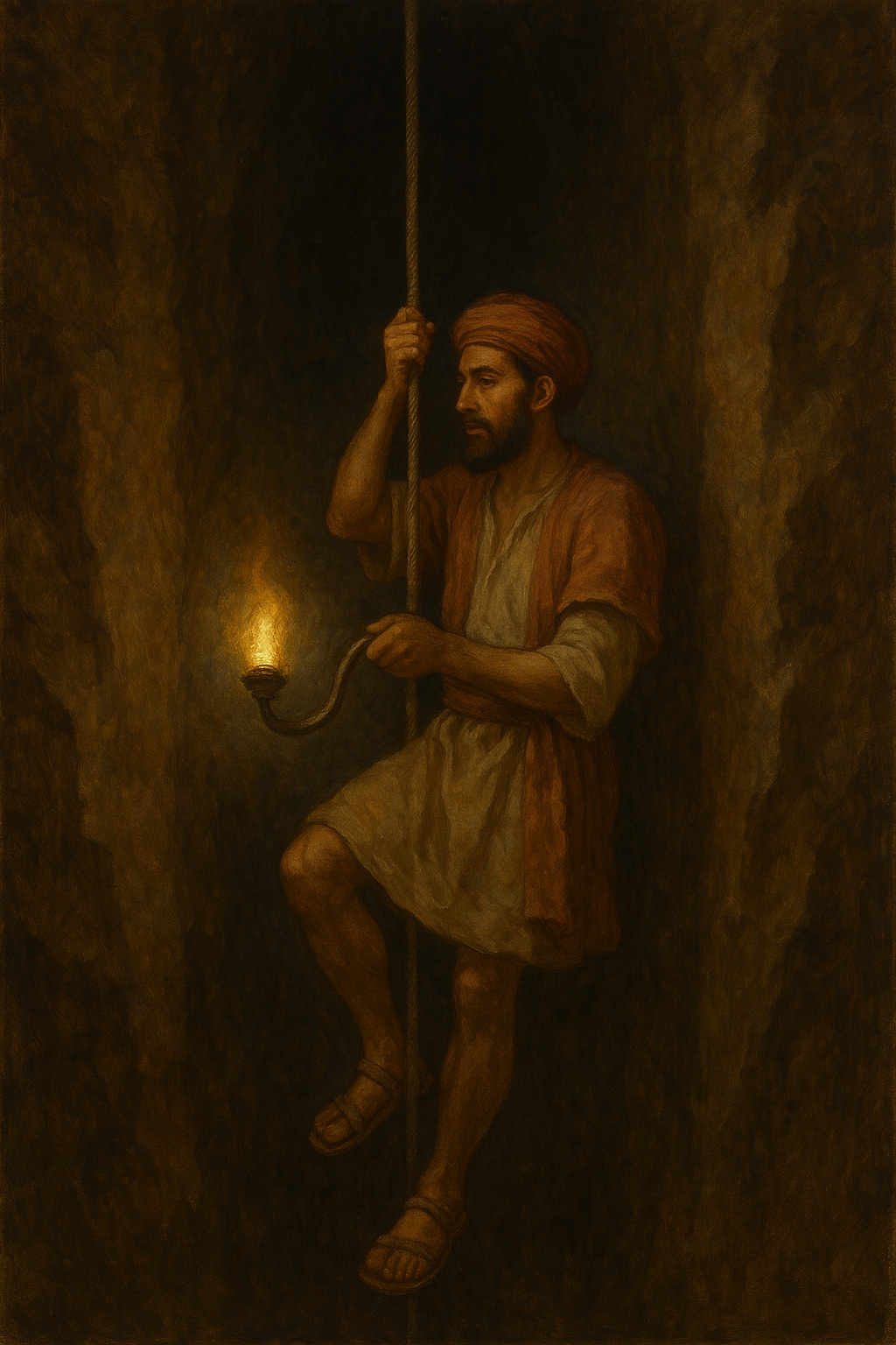 It’s a striking image: a solitary miner, suspended by a rope, swaying in silence, risking everything to find something hidden.